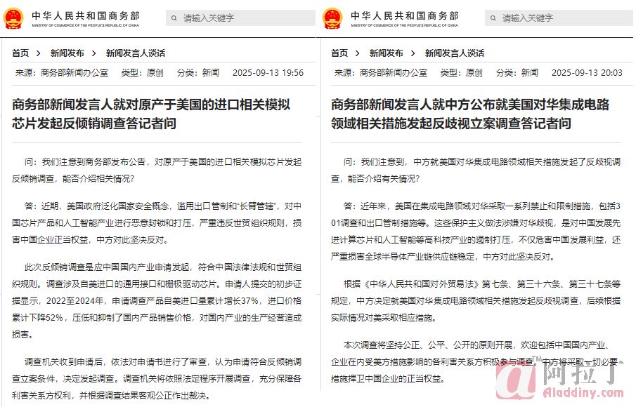 同日,商务部对外发布2025年第50号公告,就美国对华集成电路领域相关措施发起反歧视立案调查。商务部对外表示,获得初步证据和信息显示,美国对华集成电路领域相关措施符合《中华人民共和国对外贸易法》第七条规定的“在贸易方面对中华人民共和国采取歧视性的禁止、限制或者其他类似措施”的情形。本次调查自2025年9月13日开始,调查期限通常为3个月,特殊情况下可适当延长。
