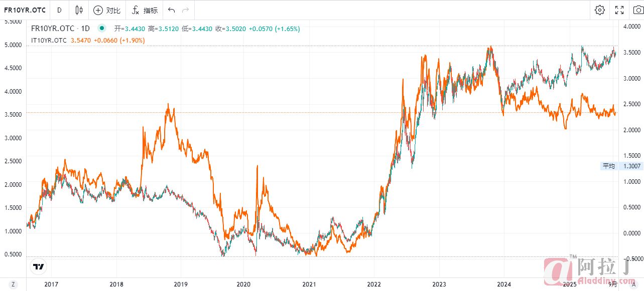 9月初债市抛售潮席卷大西洋两岸,美国30年期国债收益率上涨5.3个基点至4.97%,英国30年期国债收益率触及1998年以来最高水平,美国和德国长期国债收益率大幅攀升,触及多年新高。法国10年期国债收益率已超过西班牙、葡萄牙和希腊,这些国家曾是欧债危机的中心。法国与德国10年期国债的利差仍维持在77个基点的高位,凸显投资者对法国财政前景的担忧。