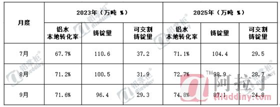 从上述表中,我们可以明显看出,2025年相比2023年,无论是铝水本地转化率快速回升、还是月度铸锭量及可交割铸锭量明显减量,都意味着国庆节后累库压力都将明显低于2023年同期。且从阿拉丁(ALD)目前持续调研了解情况来看,十一期间各地铝工业园区铝水需求量明显缩量的情况较为罕见,这都利于国庆节后去库拐点的早一刻到来。