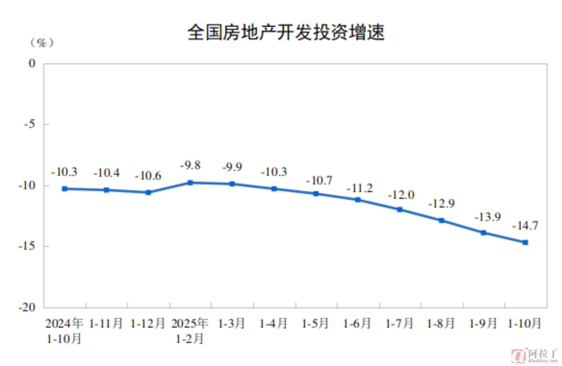 1—10月份,全国房地产开发投资73563亿元,同比下降14.7%其中,住宅投资56595亿元,下降13.8%。