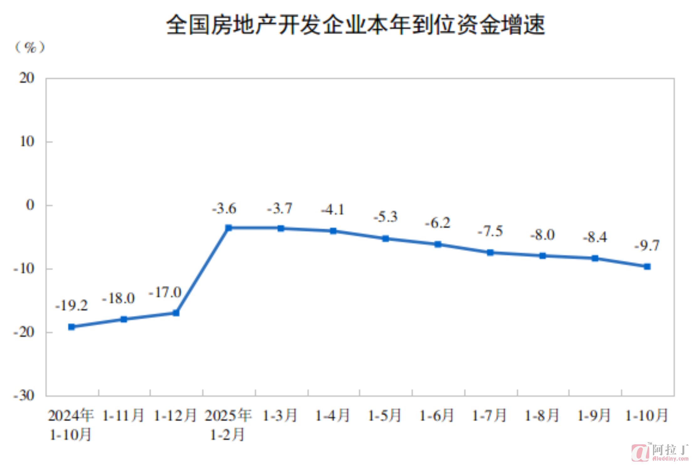 1—10月份,房地产开发企业到位资金78853亿元,同比下降9.7%。其中,国内贷款12160亿元,下降1.8%;利用外资19亿元,下降37.5%;自筹资金28419亿元,下降10.0%;定金及预收款23257亿元,下降12.0%;个人按揭贷款10834亿元,下降12.8%。