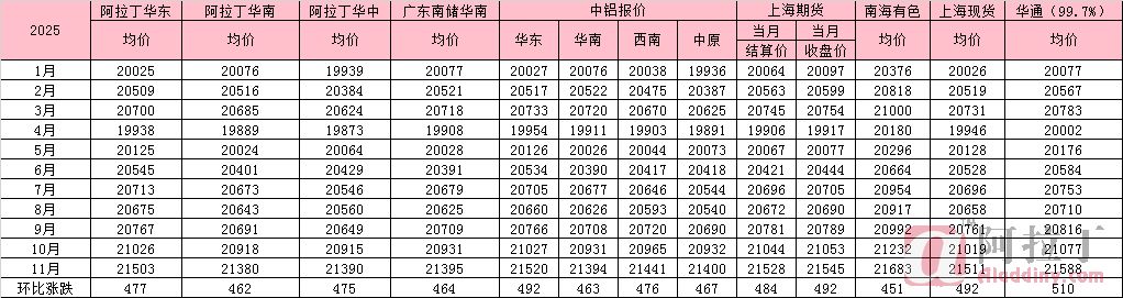 2025年11月铝锭国内各市场平均价(按月统计)