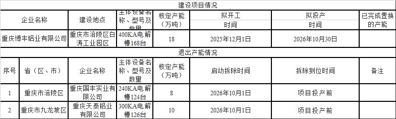 2025年11月21日—12月4日,按照《国务院办公厅关于营造良好市场环境促进有色金属工业调结构促转型增效益的指导意见》和《工业和信息化部关于电解铝企业通过兼并重组等方式实施产能置换有关事项的通知》相关要求,重庆市经济和信息化委员会对重庆博丰铝业有限公司建设18万吨电解铝项目产能置换方案及重庆天泰铝业有限公司、重庆国丰实业有限公司电解铝产能退出进行了公示。公示期内没有收到异议,现予以公告,欢迎社会公众监督。