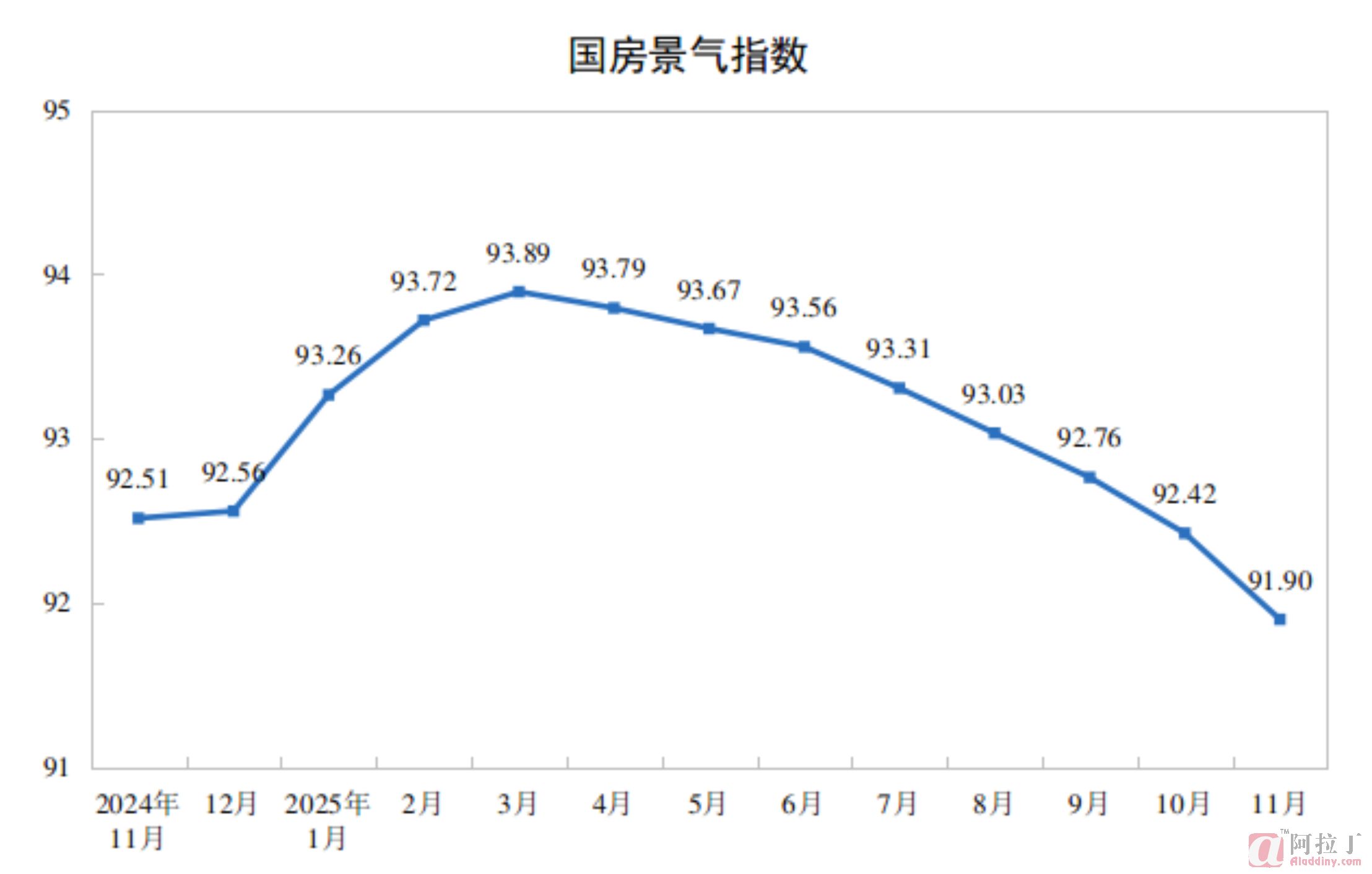 11月份,房地产开发景气指数(简称“国房景气指数”)为91.90。
